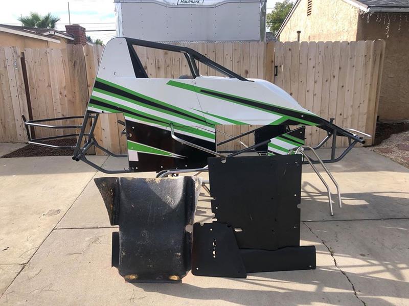 3 race old powder coat and wrap. Includes chassis, torque tube hoop, complete body, visor, dash, floor pan, engine plate, throttle peddle, front and rear bumper, left and right knerf bars. Spares include left and right knerf bars, rear bumper, lower panels, visor, front number panel (needs paint).